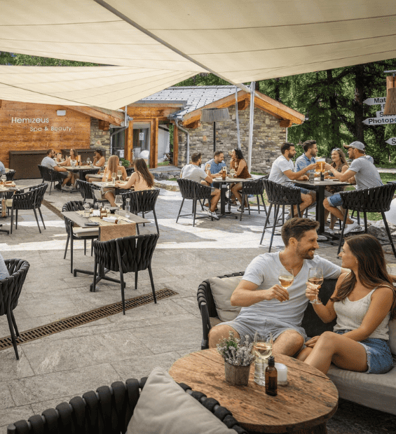 Ein entspannter Sommertag im Restaurant Genepy mit feinem Essen, Live-Musik und alpiner Atmosphäre.